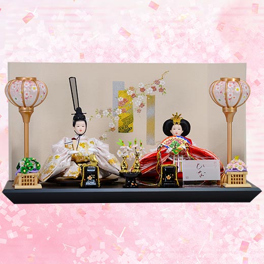 - 白地に金糸刺繍を施した衣装着。オーク台に金彩屏風を飾ったコンパクトでも素敵なお雛様。